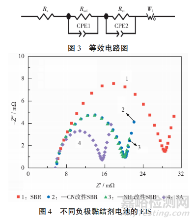 按圖3所示的等效電路圖對4組電池進(jìn)行擬合,得到的EIS見圖4。從圖4可知,在中高頻區(qū),與其他組的電池相比,組4電池的阻抗弧半徑更小。這部分阻抗主要是電荷轉(zhuǎn)移阻抗(Rct)與固體電解質(zhì)相界面阻抗(Rsei),其中Rct的占比要高于Rsei,意味著組4電池相對于其他電池具有更低的Rct,與DCR測試結(jié)果一致。