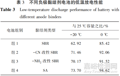 在-20℃和0℃下,不同黏結(jié)劑電池以1.0C放電的性能見表3。從表3可知:在-20℃下,組4電池與組1電池與25℃容量之比分別為73.70%與62.92%,差值為10.78個百分點;在0℃下,組4電池與組1電池與25℃容量之比分別為94.62%與85.42%,差值為9.20個百分點。分析可知,SA黏結(jié)劑中存在的酯類官能團(tuán)可以改善黏結(jié)劑與電解液的親和性,在低溫條件下有利于放電過程中 Li+的遷移。