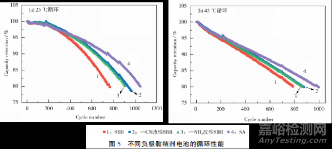 從圖5(b)可知:在45℃,以2.2C循環(huán)至700次時,組1~組4電池的容量保持率分別為82.5%、84.3%、84.0%和86.2%,也是組4電池的最高。組4電池循環(huán)性能提升的主要原因是SA類黏結(jié)劑的內(nèi)阻更低,在2.2C高倍率充放電條件下,較低的內(nèi)阻避免了產(chǎn)熱帶來的溫升及活性鋰消耗,從而提高了容量保持率。