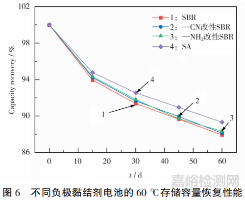 電池充滿電后在溫度為60℃的環(huán)境下擱置60d,容量恢復(fù)率的對比見圖6。從圖6可知,在第60d時,組1~組4電池的容量恢復(fù)率分別為87.93%、88.12%、88.33%和89.32%,其中組4電池在高溫存儲后容量穩(wěn)定性最佳,表明在高溫下,SA類黏結(jié)劑的穩(wěn)定性優(yōu)于SBR類黏結(jié)劑。