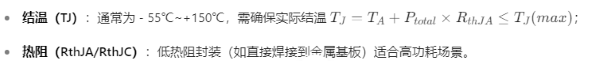大功率場景下散熱設(shè)計不足,器件長期工作在高溫區(qū)(超過結(jié)溫 Tjmax),導(dǎo)致性能退化或熱失控;