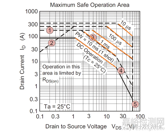 SOA(Safe operating area)是指安全工作區(qū),由一系列限制條件組成的一個漏源極電壓VDS和漏極電流ID的二維坐標(biāo)圖,開關(guān)器件正常工作時的電壓和電流都不應(yīng)該超過該限定范圍。
