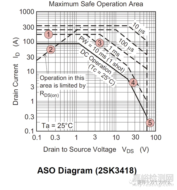 A線 是由導(dǎo)通電阻RDS(on)max[ID=VDS/RDS(on)]限制的區(qū)域。該區(qū)域一般與ASO區(qū)域分開討論。