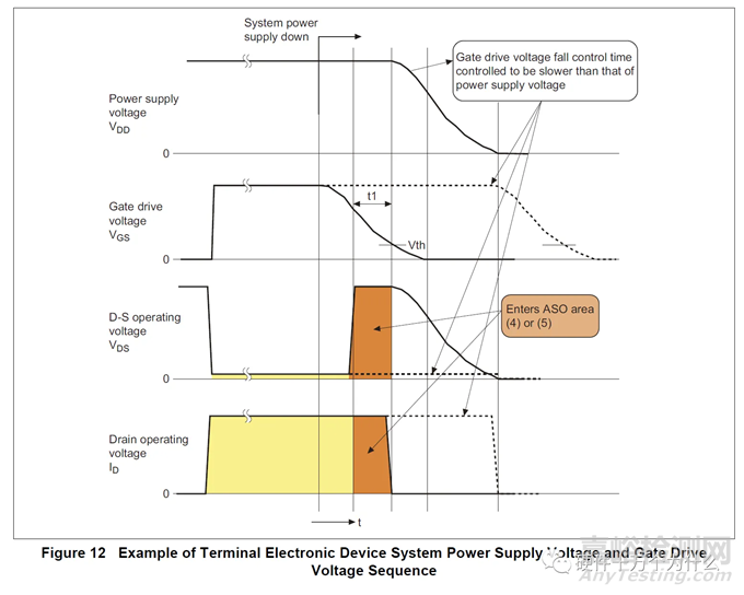 如圖中的實線所示,如果直到電源電壓VDD關(guān)閉的下降時間長于柵極驅(qū)動電壓VGS的下降時間,則VGS在圖中的周期t1處于欠驅(qū)動狀態(tài),并進(jìn)入ASO限制區(qū)域(4)或(5),因此有必要確認(rèn)其是否處于安全操作區(qū)域。