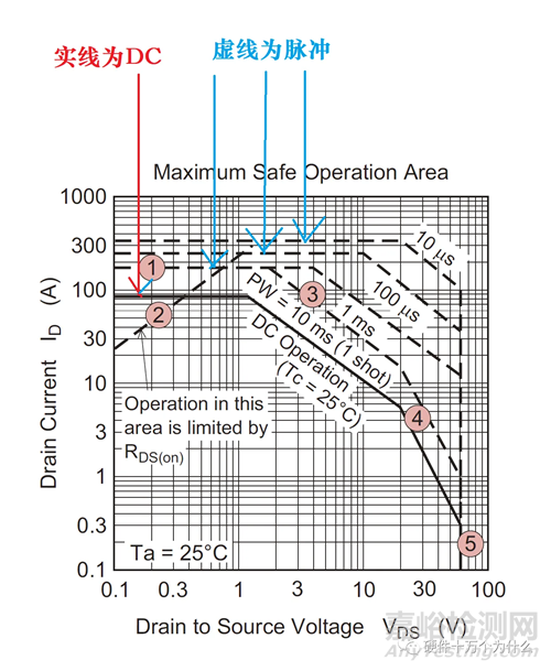 B線 是受最大額定電流IDC(穩(wěn)態(tài)直流)、ID(pulse)(脈沖)max限制的區(qū)域。即:Ids能夠承載最大電流限制的線。