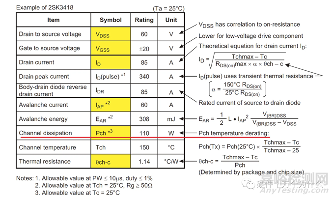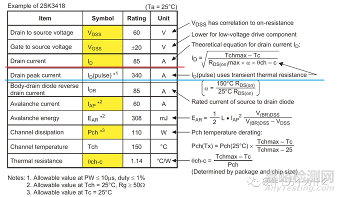 需要注意的是IDM是脈沖工作狀態(tài)的最大電流IDC,通常最大漏極脈沖電流IDM為連續(xù)漏極電流ID的3到4倍,因此脈沖電流要遠(yuǎn)高于連續(xù)的直流電流。