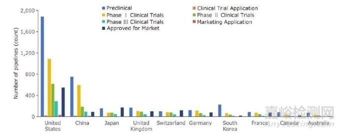 盡管與美國相比仍有較大差距,但這顯示了中國在醫(yī)藥領(lǐng)域的快速發(fā)展和日益增強(qiáng)的國際影響力。其他國家如日本、英國、瑞士、德國、韓國、法國、加拿大和澳大利亞的FIC藥物總數(shù)和全球份額相對(duì)較低。這些國家同樣參與了首創(chuàng)新藥(FIC)的競(jìng)爭(zhēng),但其整體活躍度與美國和中國相比仍處于較低水平。從研發(fā)階段分布來看,多數(shù)國家的首創(chuàng)新藥在批準(zhǔn)階段數(shù)量最多,申報(bào)階段次之,臨床前階段藥物數(shù)量最少(圖2B)。