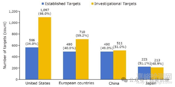 圖2C. 各國在創(chuàng)新藥物研究中已建立和正在研究的藥物靶點(diǎn)分布