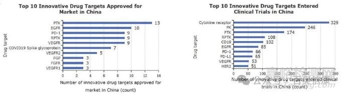 圖 1B. 中國批準(zhǔn)上市和進(jìn)入臨床試驗(yàn)的十大創(chuàng)新藥物靶點(diǎn)