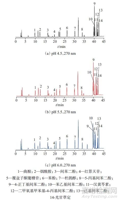 根據(jù)文獻(xiàn)[10]和文獻(xiàn)[12],有機(jī)相多為甲醇,水相為0.02 mol/L磷酸二氫鉀溶液,在該流動(dòng)相條件下各組分圖譜峰形較好,只有個(gè)別組分難以完全分離。在試驗(yàn)過(guò)程中發(fā)現(xiàn),流動(dòng)相pH值對(duì)化合物的穩(wěn)定性和分離度有影響。目標(biāo)化合物多含有酚羥基或羧基而顯酸性,因而采用酸性流動(dòng)相,但pH值太低熊果苷和氫醌不穩(wěn)定。用100 g/L氫氧化鉀調(diào)節(jié)流動(dòng)相pH值,考察了不同pH值(4.5、5.5、6.0)對(duì)色譜分離的影響,結(jié)果如圖1所示。由圖1可以看出,當(dāng)pH值為6.0時(shí),4-正丁基間苯二酚、苯乙基間苯二酚和漢黃芩素,二甲氧基甲苯基-4-丙基間苯二酚和己基間苯二酚能夠達(dá)到基線分離,且其他組分無(wú)干擾,綜合考慮選擇流動(dòng)相pH值為6.0。