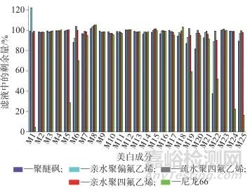 Fig. 2 Remaining amount of 25 whitening ingredients filtered by different material filter membranes