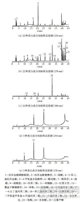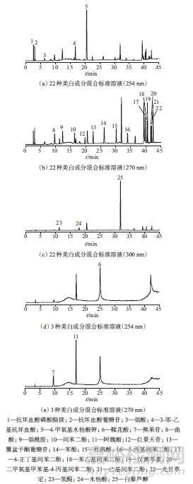 建立了高效液相色譜法同時(shí)測(cè)定祛斑美白類化妝品中25種美白成分的分析方法。該方法樣品處理簡(jiǎn)單、操作方便、準(zhǔn)確度高、重復(fù)性好、覆蓋組分