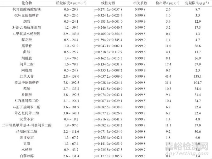 Tab. 3 Linear ranges of mass concentration,linear equations,correlation coefficients,detection limits,and quantification limitsof 25 whitening ingredients