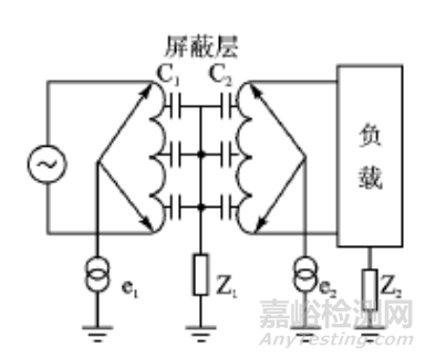 共模干擾作為一種顯著的干擾形式,其傳播主要依賴于變壓器繞組間的耦合電容。通過在變壓器的初級與次級之間引入屏蔽層并確保其有效接地,干擾電壓得以通過屏蔽層進行旁路,進而降低輸出端的干擾電壓水平。該屏蔽層對變壓器的能量傳輸特性無負面影響,然而,它會對繞組間的耦合電容產(chǎn)生作用。圖2展示了帶有屏蔽層的隔離變壓器中共模干擾的傳播路徑。圖中,C1代表初級繞組與屏蔽層之間的分布電容,C2代表次級繞組與屏蔽層之間的分布電容,Z1為屏蔽層接地阻抗,Z2為負載對地阻抗,e1為初級干擾(共模)電壓,e2為次級干擾(共模)電壓。