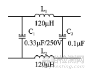 一般情況下,在圖1所示的電路中再加一級差模濾波器,用于衰減差模干擾。通常,差模濾波器的設(shè)計如圖3所示。