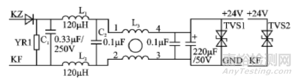 在圖5中,KZ和KF連接至24伏直流電源;YR1是一個壓敏電阻器,其電壓閾值為1.5倍的24伏,即36伏,用于抵抗浪涌沖擊;L1、L2、C1和C2共同構(gòu)成了一個平衡型LC濾波器,用以抑制差模干擾;L3是一個共模電感,其作用是抑制共模干擾;TVS1則用于抑制電快速瞬變脈沖群干擾。需要注意的是,如果GND無法通過機殼接地,那么必須添加TVS2連接至KF,其目的是將瞬變脈沖干擾信號引導(dǎo)至大地。