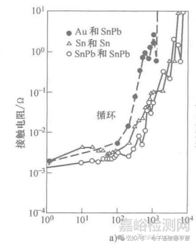 當金與錫或錫鉛焊料接觸產(chǎn)生微動時,接觸電阻升高的速度甚至會比錫-錫和錫鉛焊料之間接觸時還要快,這是由于不同類型金屬表面在破壞氧化物并重建干凈接觸表面的難度較高而造成的結果。接觸金屬間的一個薄層可能由于微動而磨損,特別是在缺少潤滑的情況下,接觸電阻的特性變得與底層金屬相近。
