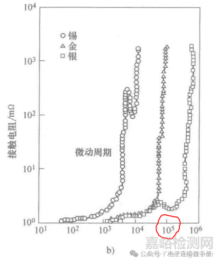 對比上圖試驗結果,銀鍍層和銀鍍層配合時,剛好滿足LV214標準的微動壽命要求,錫鍍層與錫鍍層,或者金鍍層與金鍍層配,都無法滿足LV214的微動壽命100000次要求。三種配對中,錫和錫對配時,微動效果是最差的!