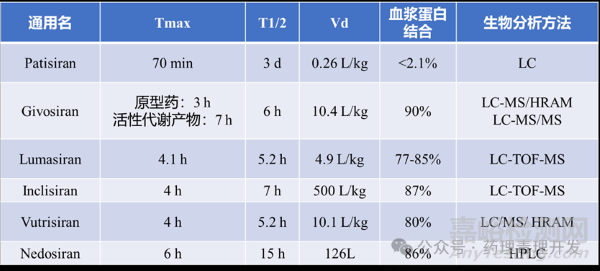 分析方法方面,基本都有液相技術(shù),只不過有的是純液相,有的是液相串聯(lián)質(zhì)譜技術(shù)。分析的RNA成分也有區(qū)別。Lumasiran、vutrisiran和nedosiran檢測的反義鏈,givosiran和patisiran檢測雙鏈,inclisiran則測的反義鏈/正義鏈的比例。