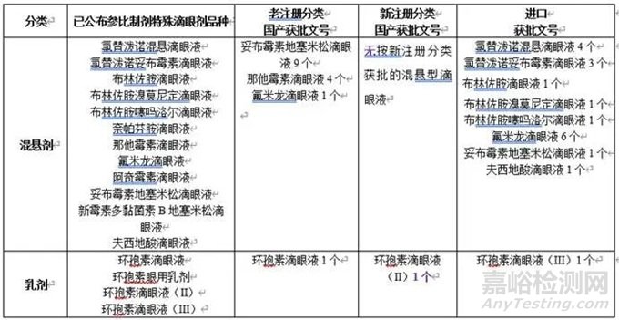 國內(nèi)市場上的滴眼劑以溶液型居多,約90%的滴眼劑均是溶液型,混懸型和乳劑型滴眼液極少。經(jīng)前期文獻調研,匯總了目前混懸型和乳劑滴眼劑的相關情況,具體如下表所示: