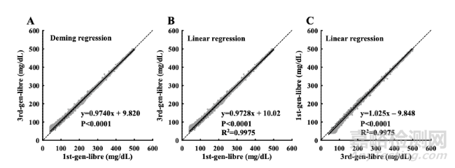 圖1 散點(diǎn)圖顯示了第一代和第三代CGM系統(tǒng)讀數(shù)間的關(guān)系。實(shí)線分別為(A)Deming回歸,和(B)(C)線性回歸的最佳擬合線