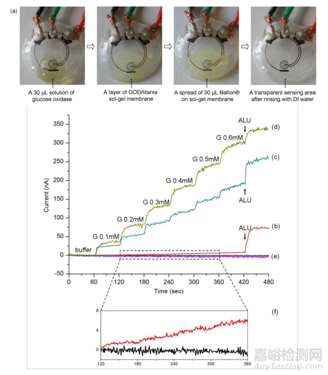 圖3 2011年發(fā)表的文章中,University of Washington的研究者們嘗試將葡萄糖傳感器集成到隱形眼鏡上。具體操作為在干凈的PET基板上用光刻膠覆蓋基板并通過掩模版暴露在紫外線下,隨后對(duì)光刻膠進(jìn)行顯影,在樣品上蒸發(fā)薄金屬膜,隨后切割得到隱形眼鏡形狀的傳感器并使用酶進(jìn)行功能化。上圖即為傳感器經(jīng)過表明該性后的圖像,以及相關(guān)的測(cè)量響應(yīng)。(a)傳感器經(jīng)過葡萄糖氧化酶(Glucose oxidase,GOD)/二氧化鈦/Nafion預(yù)處理后的連續(xù)圖像;(b)剛與GOD連接的傳感器的測(cè)量電流響應(yīng);(c)用GOD/二氧化鈦溶膠-凝膠制備的傳感器的測(cè)量電流響應(yīng);(d)用GOD/二氧化鈦/Nafion制備的傳感器的測(cè)量電流響應(yīng);(e)相同預(yù)處理(b)、(c)和(d)的三個(gè)對(duì)照;(f)120-360秒的(b)曲線,以及和對(duì)照的放大圖
