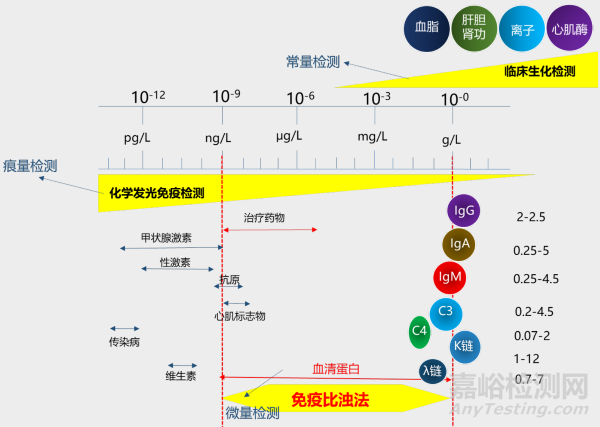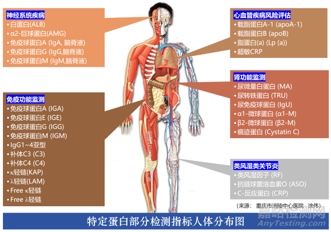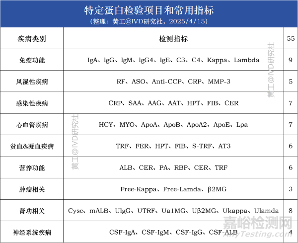 特定蛋白檢驗項目,共有9個疾病大類,超過55個檢測指標(biāo)。下表是不完全列舉,還有其他一些使用頻次不高,或者新興的指標(biāo)。