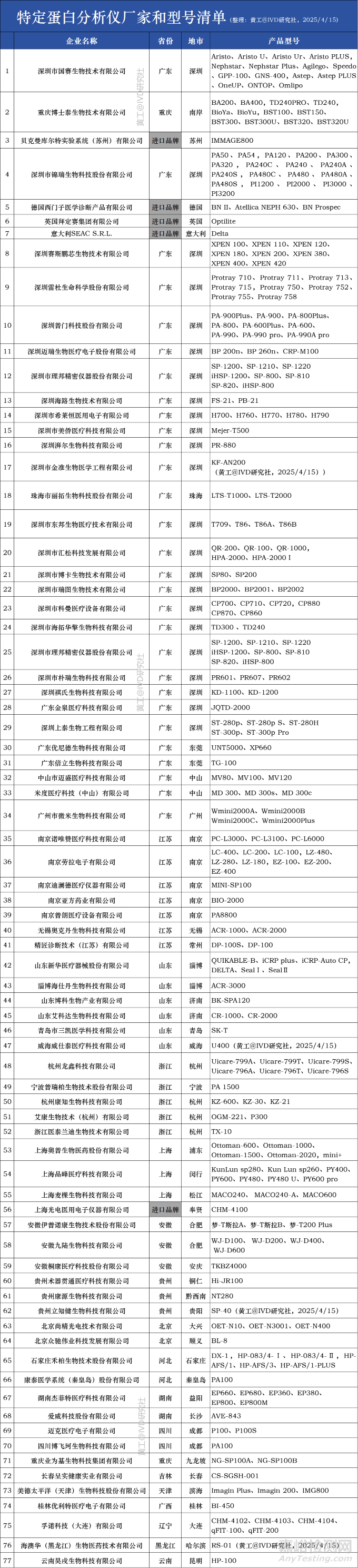 從上表看,國內(nèi)特定蛋白分析儀,來自廣東、江蘇、山東、浙江等19個省市,廣東最多,以國賽生物為代表,接近30家。
