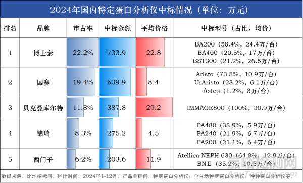 目前網(wǎng)上發(fā)布特定蛋白分析儀中標(biāo)數(shù)據(jù),只有一家。根據(jù)比地招標(biāo)網(wǎng)統(tǒng)計:2024年特定蛋白分析儀,國內(nèi)招投標(biāo)市場有220家采購單位,217家中標(biāo)單位,中標(biāo)設(shè)備數(shù)量291臺,中標(biāo)總金額約3300萬元。TOP5品牌主流型號包括:博士泰的BA200、BST300、BA400;國賽的AristoUr、Aristo、Astep;貝克曼庫爾特的IMMAGE800等;錦瑞PA480、PA240、PA200;西門子,Atellica NEPH 630、BNⅡ。前5家品牌,合計市占率達(dá)68%。