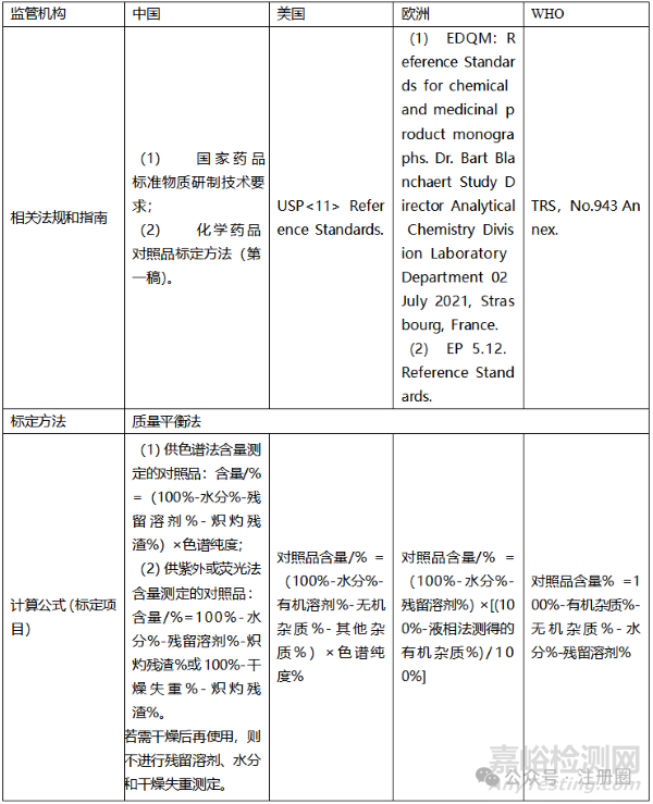 表1從相關(guān)法規(guī)和指南、標(biāo)定方法、計(jì)算公式(標(biāo)定項(xiàng)目)等方面總結(jié)了中國(guó)、美國(guó)、歐洲和WHO四大監(jiān)管機(jī)構(gòu)在對(duì)照品標(biāo)定方面的異同。