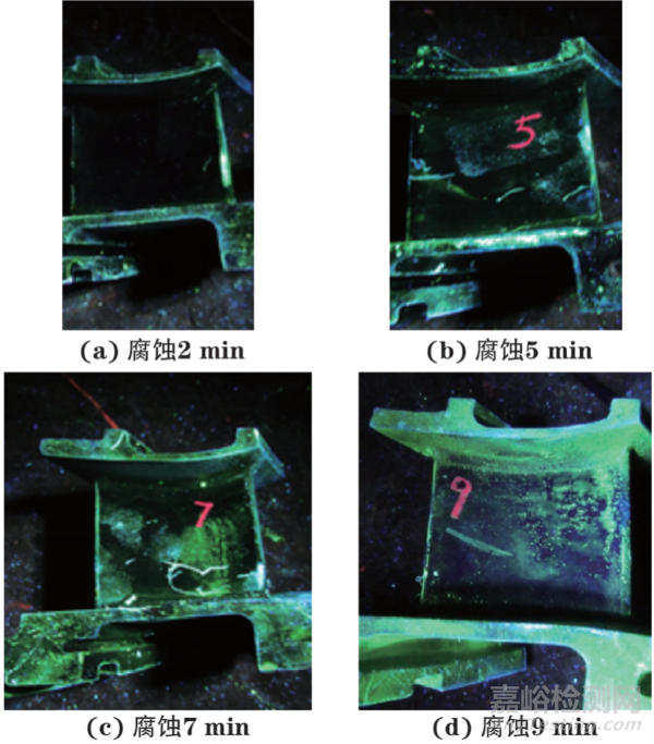 圖7 不同腐蝕時間對應(yīng)的葉片熒光滲透檢測結(jié)果