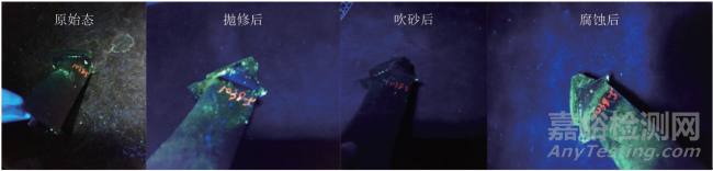 從對比情況可以看出,隨著腐蝕時間的增加,熒光背景深度逐漸變深。腐蝕過程中,待檢表面易形成腐蝕坑,影響檢測背景。由于每批葉片的腐蝕時間不定,所以顯晶腐蝕過程雖可完全打開缺陷開口,但提供的檢測背景不穩(wěn)定。