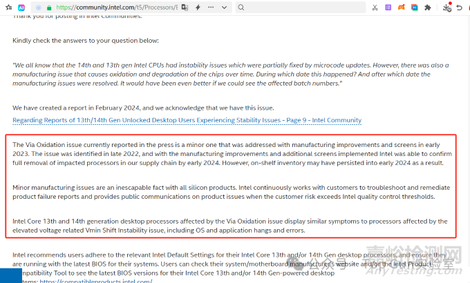 但也有少數(shù)案例報告長期不穩(wěn)定運行導致CPU永久損壞(需返修),這類故障的根因可能是芯片過孔氧化導致,Intel官方也承認在早期有一些批次有過孔氧化的問題。