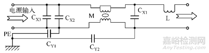 在上面的濾波電路原理圖中, 裝置內(nèi)部的干擾信號(hào)通過電容CY1 回到電源端口, 旁路了應(yīng)該發(fā)揮共模電流抑制作用的共模電感M而使傳導(dǎo)騷擾失敗。