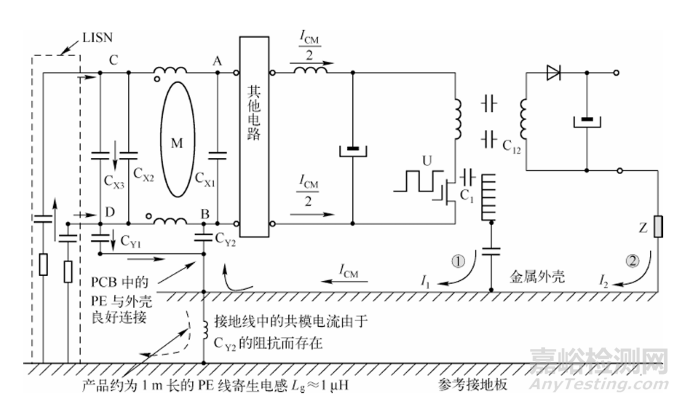 且在CY2 電容濾波較為理想 (即CY2兩端壓降在某頻率下接近于零) 且共模電流ICM 主要是從參考接地板返回到產(chǎn)品內(nèi)部的情況下的。