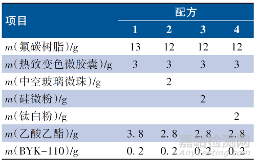 參考表1配方,將氟碳樹脂、乙酸乙酯、分散劑混合均勻得到均一穩(wěn)定的樹脂溶液。然后將熱致可逆變色微膠囊及其他顏填料加入樹脂溶液中,通過真空高速分散機(jī)分散均勻,得到熱致可逆變色氟碳樹脂涂料。將制備的熱致可逆變色涂料與適量改性HDI三聚體固化劑混合后攪拌均勻,使用指定厚度的濕膜涂布器在相應(yīng)基材表面進(jìn)行刮涂制膜,濕膜在23 ℃、相對濕度60%的條件下養(yǎng)護(hù)7 d即可得到相應(yīng)的熱致可逆變色涂層。