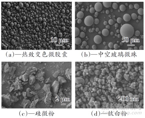 圖2為不同種類填料的掃描電鏡圖,可以看出熱致變色微膠囊為球形膠囊結(jié)構(gòu),其顆粒粒徑在1~5 μm 的范圍內(nèi),形狀較為飽滿,由于其為中空結(jié)構(gòu),因此有少量出現(xiàn)干癟現(xiàn)象,部分微膠囊表面附有不同大小的顆粒,這是由于在原位聚合包覆的過程中有部分壁材聚合物在溶液中進(jìn)行自聚形成小顆粒后附著在微膠囊表面。中空玻璃微珠為粒徑更大、形態(tài)更飽滿的球形結(jié)構(gòu),粒徑分布較寬,為5~50 μm。而硅微粉和鈦白粉均為不規(guī)則的塊狀顆粒,硅微粉的粒徑分布在2~10 μm,鈦白粉則粒徑更小,在100~500 nm的范圍內(nèi)。