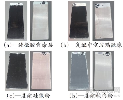 圖3為純熱致變色微膠囊及其與不同填料復(fù)配制備的熱致變色涂層的變色效果(左為低溫,右為高溫),可以看出4種涂層均有較為明顯的變色效果,其中由于鈦白粉對微膠囊的顏色有較強(qiáng)的遮蓋作用,導(dǎo)致該涂層的2種不同顏色均明顯更淺。