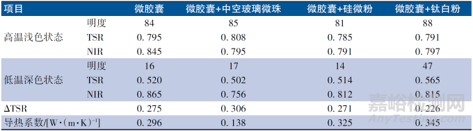 從表2可以看出,使用硅微粉與變色微膠囊復(fù)配的涂層性能與純變色微膠囊制備的涂層性能相近,雖然在高溫淺色狀態(tài)時(shí)明度下降導(dǎo)致太陽光反射率和近紅外反射率有所降低,但由于其高低溫狀態(tài)的作用相似,因此該涂層的太陽光調(diào)制性能與純微膠囊涂層基本相當(dāng),ΔTSR為0.27左右。使用鈦白粉復(fù)配時(shí),由于其本身較強(qiáng)的著色力和遮蓋力,導(dǎo)致涂層在低溫條件下依然具有較高的明度及太陽光反射率,因此太陽光調(diào)制能力有一定程度的降低,ΔTSR僅為約0.22。使用中空玻璃微珠復(fù)配時(shí),涂層的明度變化與純變色微膠囊涂層的相近,但摻有中空玻璃微珠的涂層的太陽光調(diào)制能力有所增強(qiáng),ΔTSR達(dá)0.3以上,表現(xiàn)出更佳的控溫性能,這主要是由于相較純微膠囊涂層其在低溫條件下近紅外反射率有所降低。