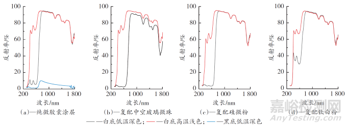 為探明復(fù)配填料種類對涂層太陽光調(diào)制性能的作用機(jī)制,對不同狀態(tài)涂層的紫外-可見-近紅外波段反射光譜進(jìn)行了測試,結(jié)果如圖4所示。