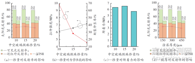 為優(yōu)化中空玻璃微珠復(fù)配熱致變色涂層綜合性能,系統(tǒng)研究了中空玻璃微珠摻量和濕膜厚度對太陽光反射性能、力學(xué)性能及對于基材附著力影響規(guī)律,結(jié)果如圖6 所示,其中(a)~(c)中濕膜厚度為150 μm,(d)中玻璃微珠摻量為15%。