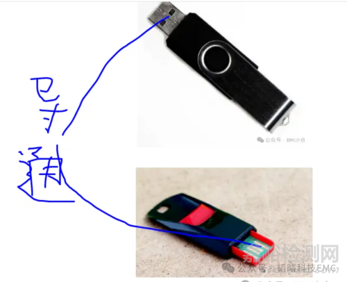 但是在實驗中發(fā)現(xiàn)一個有趣的現(xiàn)象,金屬U盤穩(wěn)定不過,塑料U盤有時候能過,有時候過不了。相對塑料U盤,金屬U盤的屏蔽性應(yīng)該更好才對,于是我們用萬用表測量了信號GND和外殼的導(dǎo)通性,奇怪的是,金屬U盤的外殼跟信號GND不通,塑料U盤的外殼跟信號GND反而是通的。