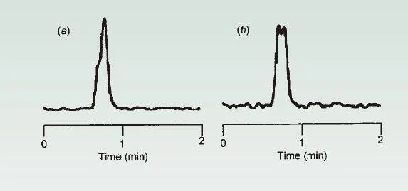 更換色譜柱不能解決此問題,所以篩板堵塞并非導(dǎo)致這一現(xiàn)象的原因。如果減少色譜柱上樣品,如圖3(b),峰形看起來更像是兩個(gè)峰,而不是一個(gè)肩形峰。