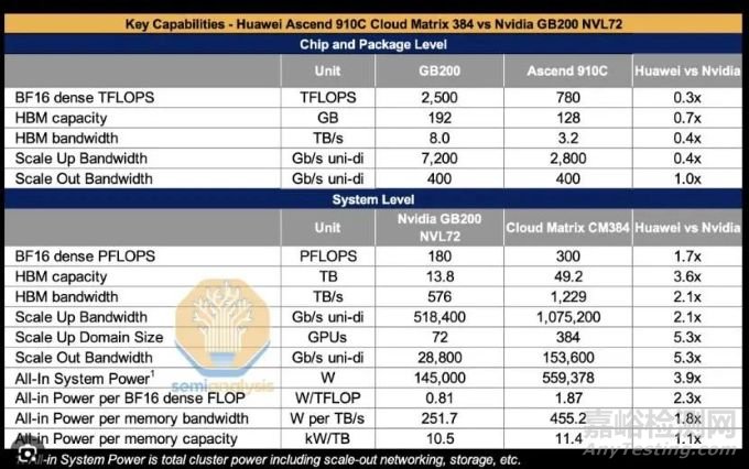 半導(dǎo)體分析機(jī)構(gòu)SemiAnalysis發(fā)布的昇騰910C與英偉達(dá)GB200的對(duì)比顯示,盡管昇騰910C芯片在HBM容量和帶寬等性能指標(biāo)上與GB200芯片仍存在一定差異,但華為通過(guò)創(chuàng)新的系統(tǒng)級(jí)設(shè)計(jì)顯著提升了整體性能。這一策略雖然也帶來(lái)了較高的功耗,但也體現(xiàn)了華為在高性能計(jì)算領(lǐng)域提升的決心。未來(lái),隨著技術(shù)的進(jìn)步,華為有望進(jìn)一步優(yōu)化能效,實(shí)現(xiàn)更平衡的發(fā)展。