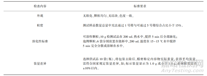 固體制劑包含的具體種類不同,采用的質(zhì)量檢測方法也不相同,應當做到質(zhì)量的全方位、針對性檢測。以固體制劑中的顆粒劑質(zhì)量檢查為例,檢測內(nèi)容與標準如表1 所示。