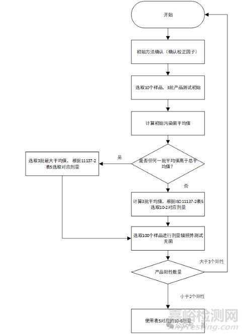 理論上使用越大的輻射劑量,微生物更容易被殺滅。但是很多材料是不耐受大的輻射劑量的,尤其是高分子材料。因此針對這種并不耐受高輻射劑量的材料來說,如果只有輻射滅菌這一種滅菌方法可選,那就需要降低輻射劑量。ISO11137.2給出了該劑量設(shè)定的常規(guī)步驟,如下流程圖所示。簡單來說,該方法就是先測定生物負(fù)載,根據(jù)生物負(fù)載平均水平選取10-2對應(yīng)的輻射劑量對產(chǎn)品進(jìn)行照射(標(biāo)準(zhǔn)ISO11137.2表格5和6查表),然后確定陽性情況是否符合要求(<2個陽性)。若符合要求,則選取對應(yīng)的10-6劑量作為設(shè)定最低劑量。