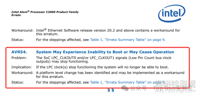 3)2017年1月,Intel修訂了Atom C2000系列產(chǎn)品文件,其中指出,芯片線路含有一個缺陷時鐘。標題為《可能導(dǎo)致系統(tǒng)無法開機或中斷操作》的AVR.54文件中指出,Atom C2000的Low Pin Count的Count bus clock輸出(LPC_CLKOUT0和LPC_CLKOUT1)可能會永久停止工作,因為對主機板上的其他元器件(包括引導(dǎo)ROM)運作上都是必要的時鐘訊號,當計時停止,導(dǎo)致其余的電子元器件也會一起停止運作,導(dǎo)致無法開機。