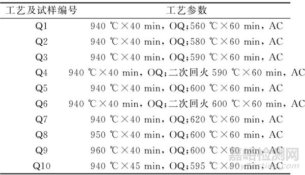 根據調質工藝的特點,分為4組分別進行分析和討論:1)比較Q1、Q2、Q3、Q5和Q7工藝,采用相同的淬火溫度和保溫時間,分析不同的回火溫度對材料組織和性能的影響;2)比較Q3和Q4以及Q5和Q6工藝,采用相同的淬火溫度、保溫時間、回火溫度和回火時間,分析不同的回火次數對材料組織和性能的影響;3)比較Q5、Q8和Q9工藝,采用相同的回火溫度和保溫時間,分析不同淬火溫度下材料組織和性能的差異;4)Q10工藝延長了淬火保溫時間,使組織均勻奧氏體化,并延長了回火時間。
