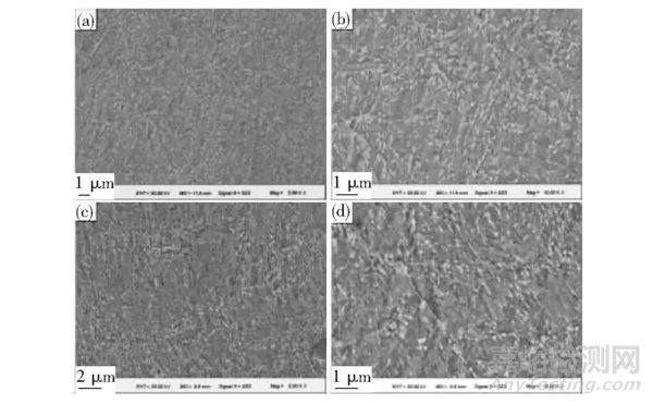馬氏體的硬度主要來自過飽和碳的固溶強化效應,整個回火過程中均伴隨著馬氏體中碳質量分數的降低,這就是回火時鋼硬度降低的根本原因。過渡碳化物的析出,雖然可產生一定的強化效果,但其影響小于固溶強化效應。在滲碳體已析出、基體碳質量分數降低至平衡值后,滲碳體的彌散強化起到主要強化機制的作用。因此,隨著滲碳體的粗大化和球化,以及鐵素體的回復和等軸化,鋼的硬度進一步降低。