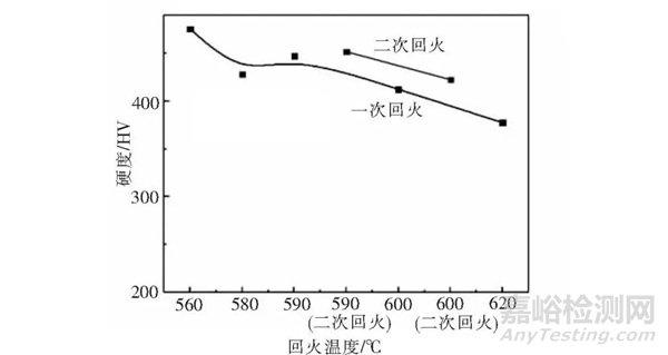 1)42CrMoVNb鋼在580~600 ℃回火時,硬度和強度無明顯下降,這是因為580 ℃左右回火會產生二次硬化現象;而當回火溫度高于600 ℃時,強度迅速下降。